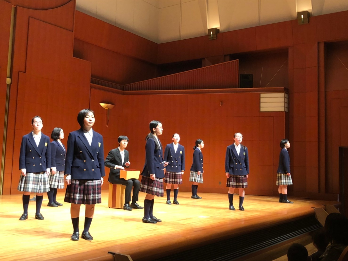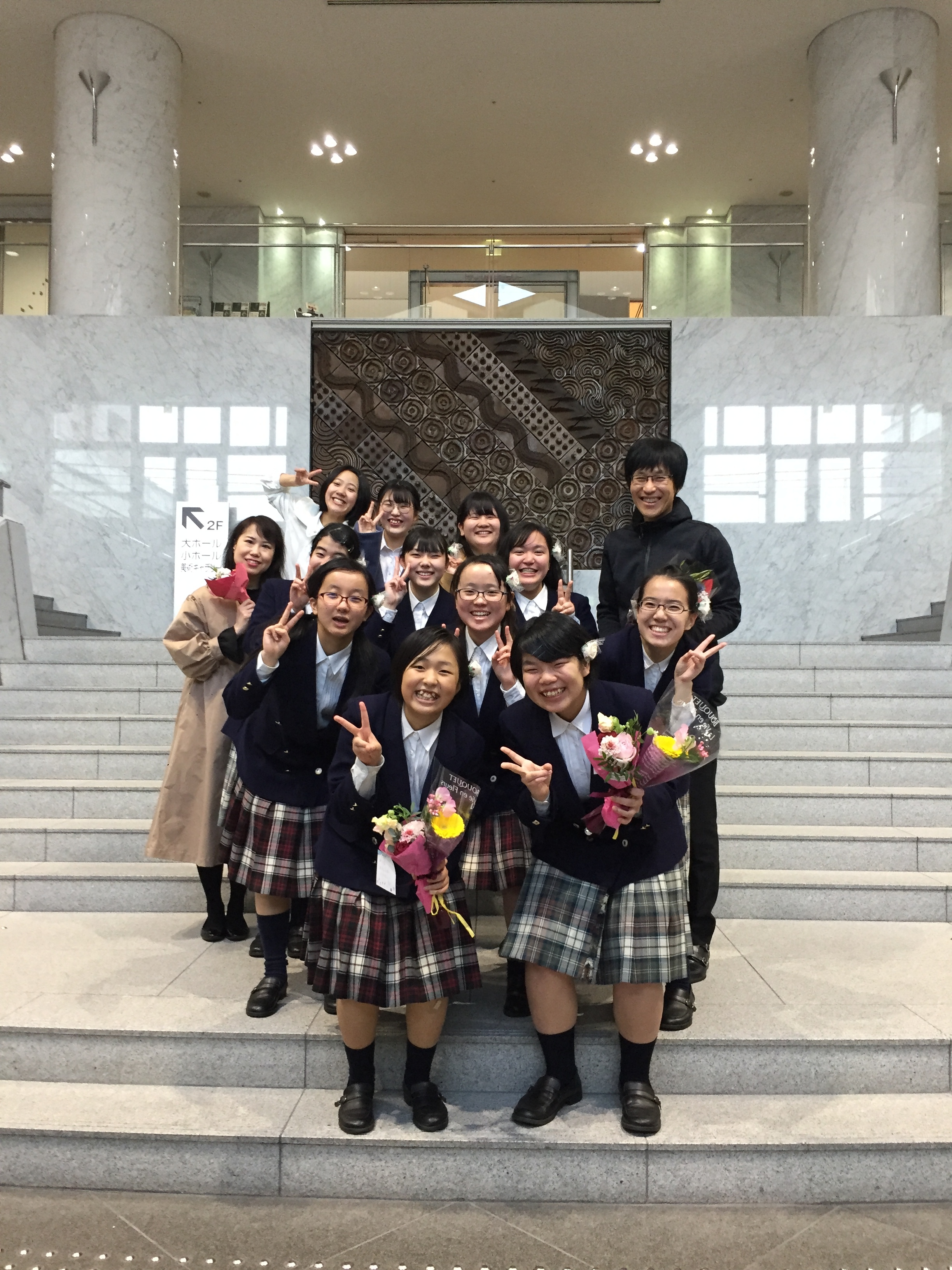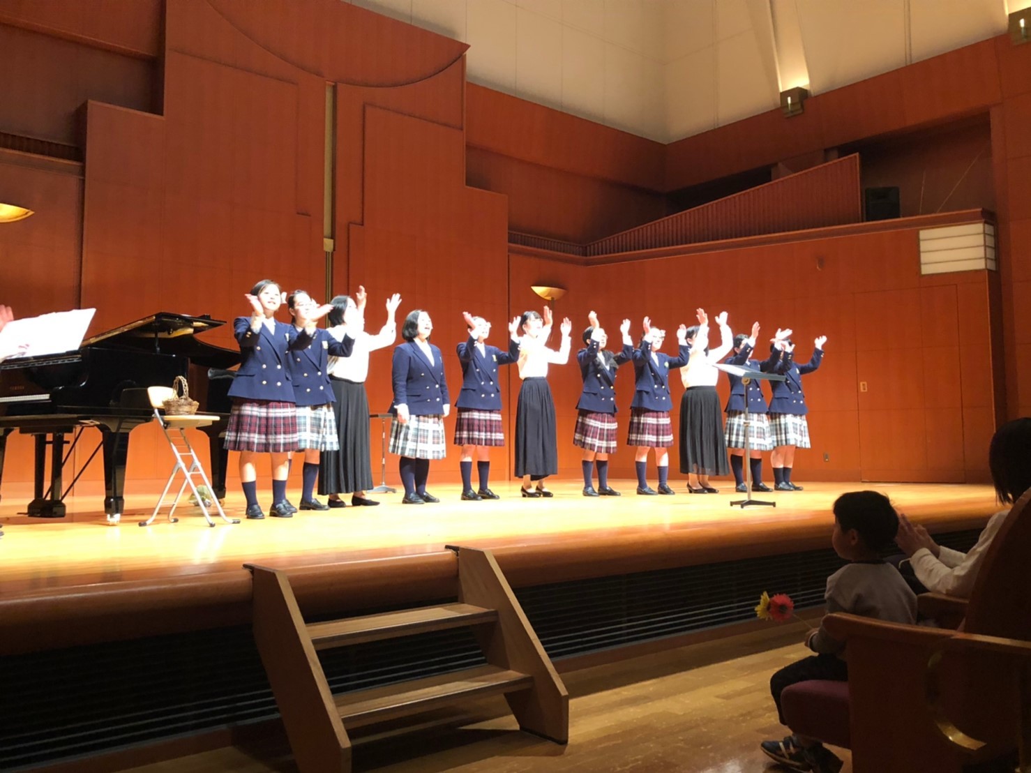 令和2年2月22日廿日市文化ホールウッドワンさくらぴあ小ホールにて、2回目のスプリングコンサートを開催しました。第1部は、国内外のアカペラ作品を中心に演奏しました。第2部では、前半にJ-pop作品をオリジナルアレンジで、後半に童謡メドレー「いつの日か」を抜粋して演奏しました。アカペラ作品は響きの良い環境の中気持ちよく演奏することができました。J-popの演奏では、マリーゴールドの花をお客さんに手渡す演出をしました。最後にOGメンバーと一緒に歌った童謡メドレー「いつの日か」では、一つ一つの曲の時代背景や詩の意味を全員で考えながら丁寧に歌いました。演奏を聴いて下さった方からは、「大好きな里の秋を聴きながら胸がいっぱいになり涙が出ました。」「遠い昔の中学時代を思い出しました。」など沢山の感想を頂きました。来年の第3回スプリングコンサートは、2021年2月23日(火)に開催を予定しています。ご来場をお待ちしております。