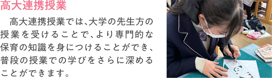 授業ではピアノや図画はもちろん、「こども教育」の基礎を習得し、大学進学を目指します。