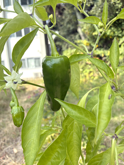 12月中旬に入り、冬らしくなってきました。夏に植えたピーマンの畑を見てみると、寒さにも負けず立派な実をつけていました。今回が今年最後のピーマン収穫となりそうです。来週は、サツマイモの畑を掘る予定です。
