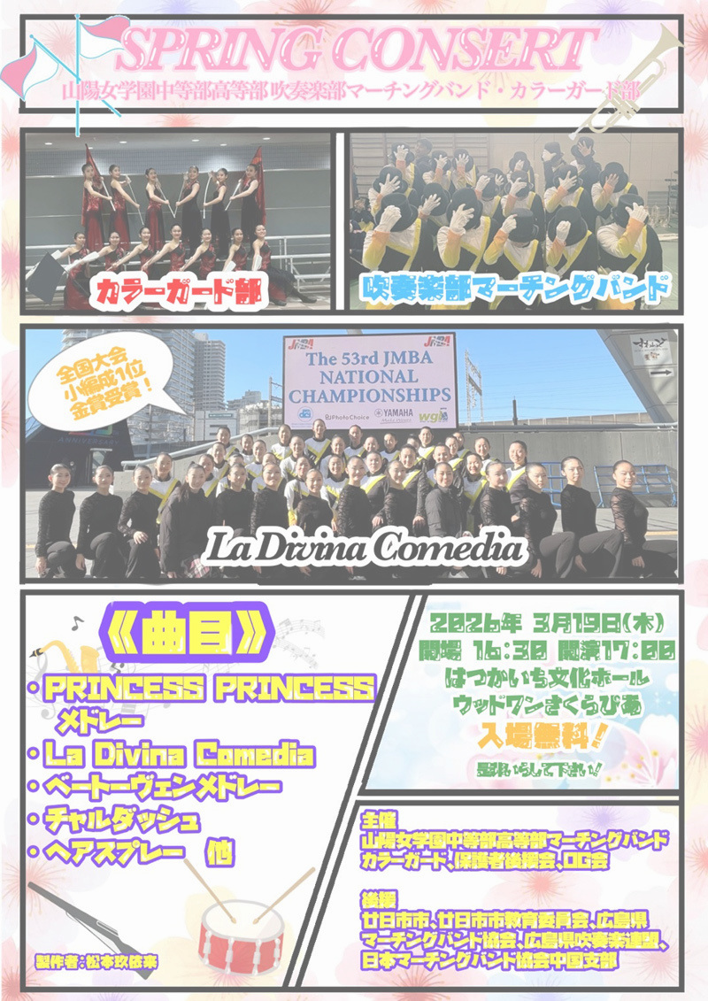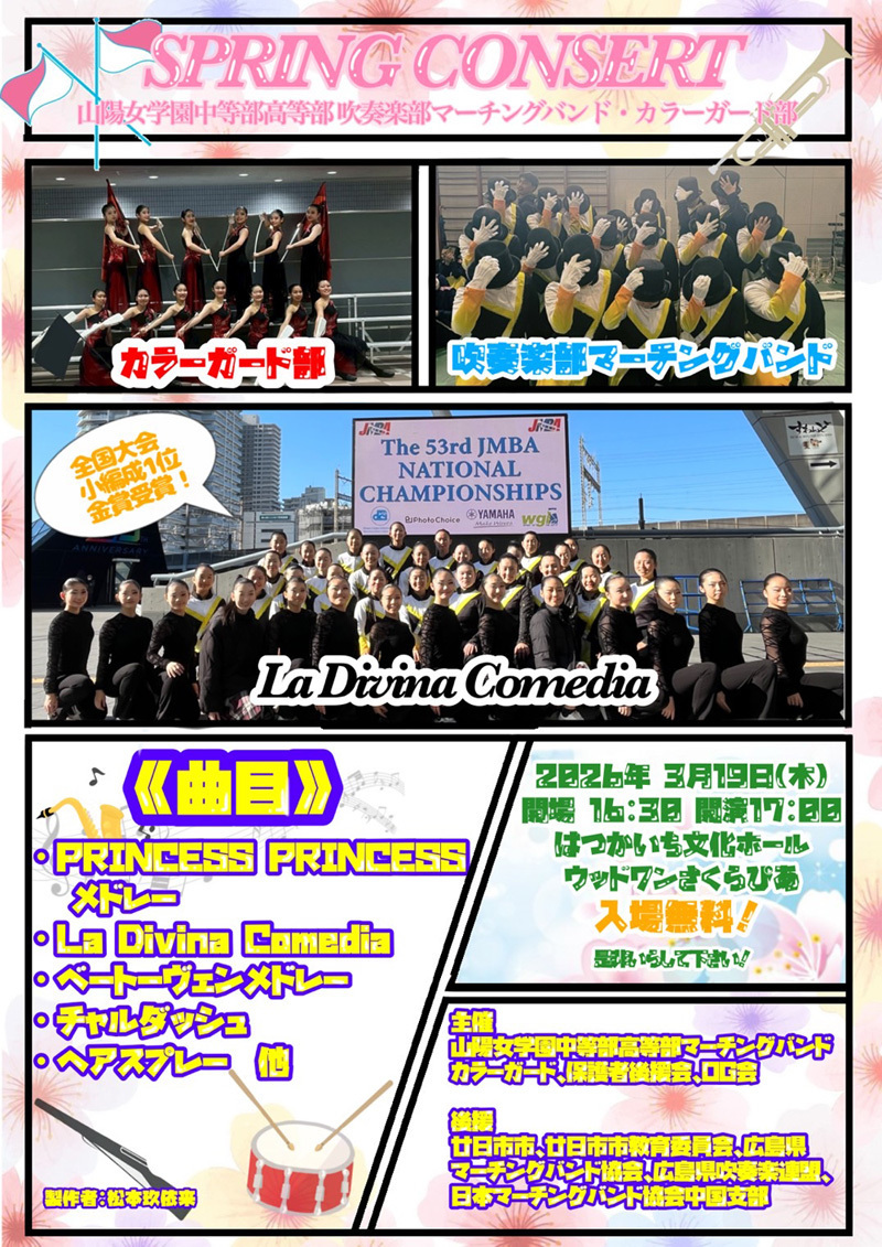 吹奏楽部マーチングバンド・カラーガード部が3月19日に第10回スプリングコンサートを開催します!