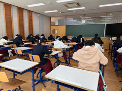 本日は高等部の入学試験が行われました。中等部3年生も高等部への進学に向けて、他の中学校からの受験生と同じように試験を受けます。慣れた教室とはいえ、普段とは違う緊張感の中で問題に挑んでいました。