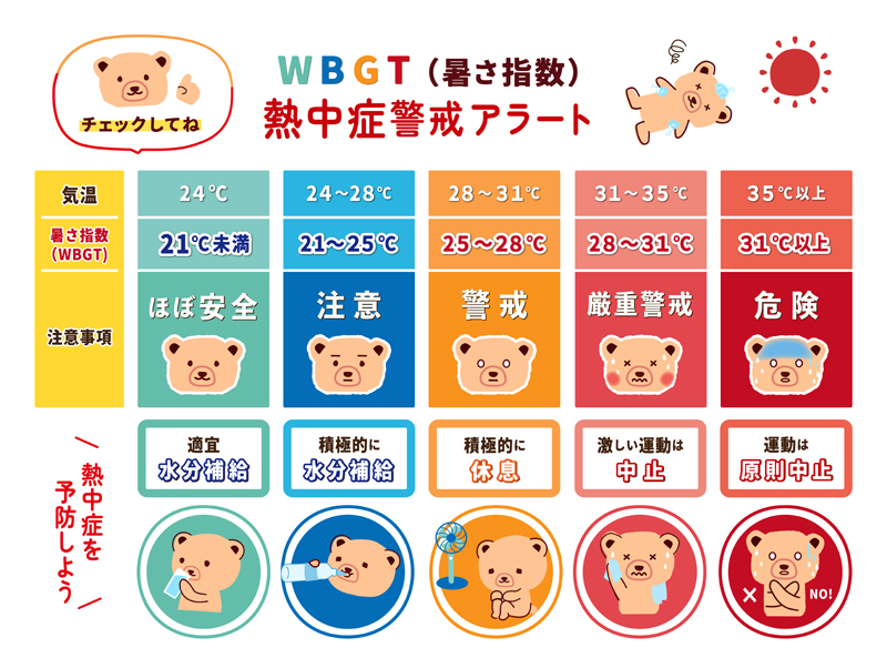 梅雨明けから一気に暑くなりましたね。夜中も気温が25℃以上の日が続いて、寝苦しい夜が続きます。と同時に、天気予報などで「熱中症警戒アラート」という言葉を耳にするようになりました。温度、湿度など熱中症の要因を数値化した「暑さ指数」に基づいて、熱中症のリスクが高まったときに、気象庁と環境省によって発表されます。「熱中症警戒アラート」がいつ、どの地域で発表されているかについては、気象庁の「熱中症予防情報サイト」から確認することができます。「熱中症特別警戒アラート」が発令されたときはは、屋外での活動が危険だということです。今年の夏も猛暑が予想されています。このような情報を意識しながら、元気に暑い夏を楽しんでいきましょう。