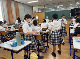 中等部1学年の家庭科の授業の様子です。このクラスはボランティア精神が強く、プリント配布などを率先して手伝ってくれます。授業では、生徒が自由に意見を出し合える雰囲気をつくり、「間違えても大丈夫」という安心感を育むことを心がけています。
