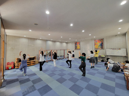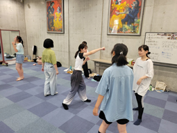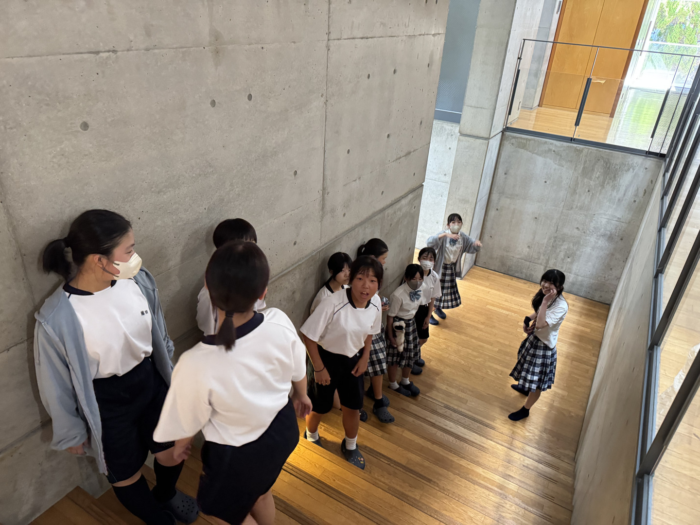 中等部ホールです。夏休みに入り、ミュージカル・演劇部が毎日練習しています。現在、文化祭に向けての準備中です。文化祭では初めてアクションに挑戦するため、基礎練習を行っていました。アクション指導は、アクションの経験のある部員が担当しています。どんな演目になるのか今からとても楽しみです。