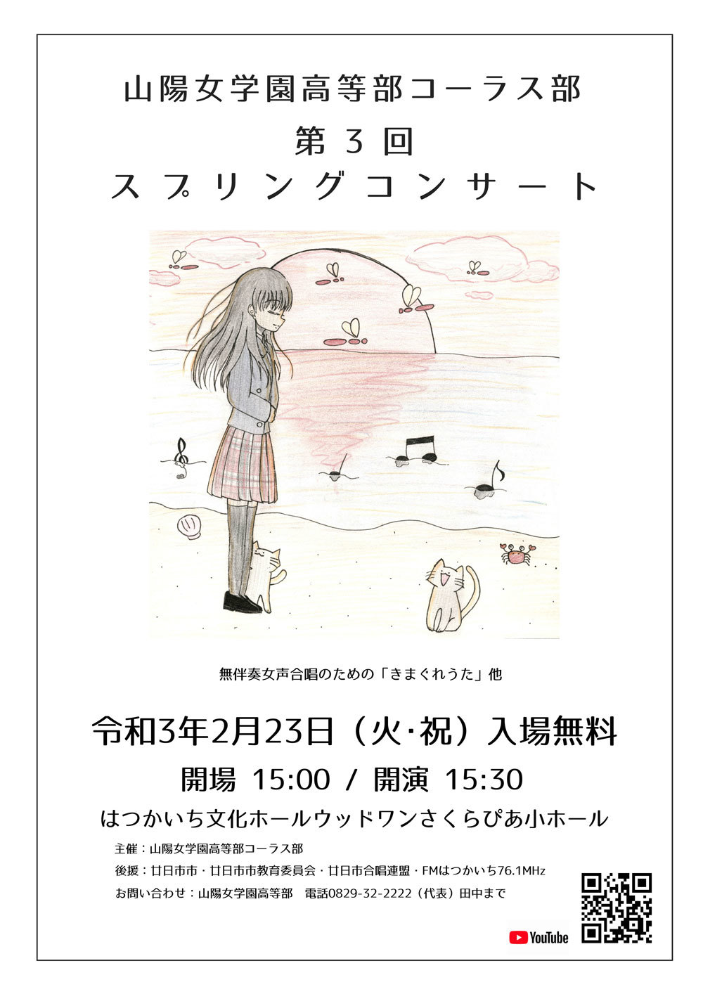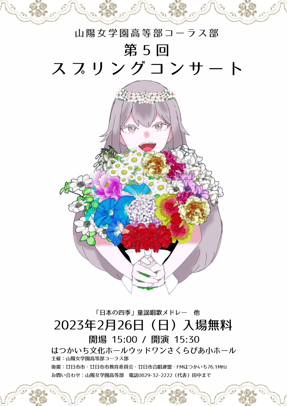 今回、コーラス部として初めての演奏会を廿日市文化ホールさくらぴあ小ホールで開催させて頂きました。ご多忙中にも関わらず多くの方にお越しいただきました。今回は特に日頃からお世話になっている方々への感謝の気持ちを歌で伝えようという思いで演奏会に臨みました。まず最初に無伴奏に編曲した山陽女学園校歌を演奏しました。続いて今年1年間練習してきた無伴奏曲、そしてOGメンバーを加え「鷗」と「ほらね、」を演奏しました。
