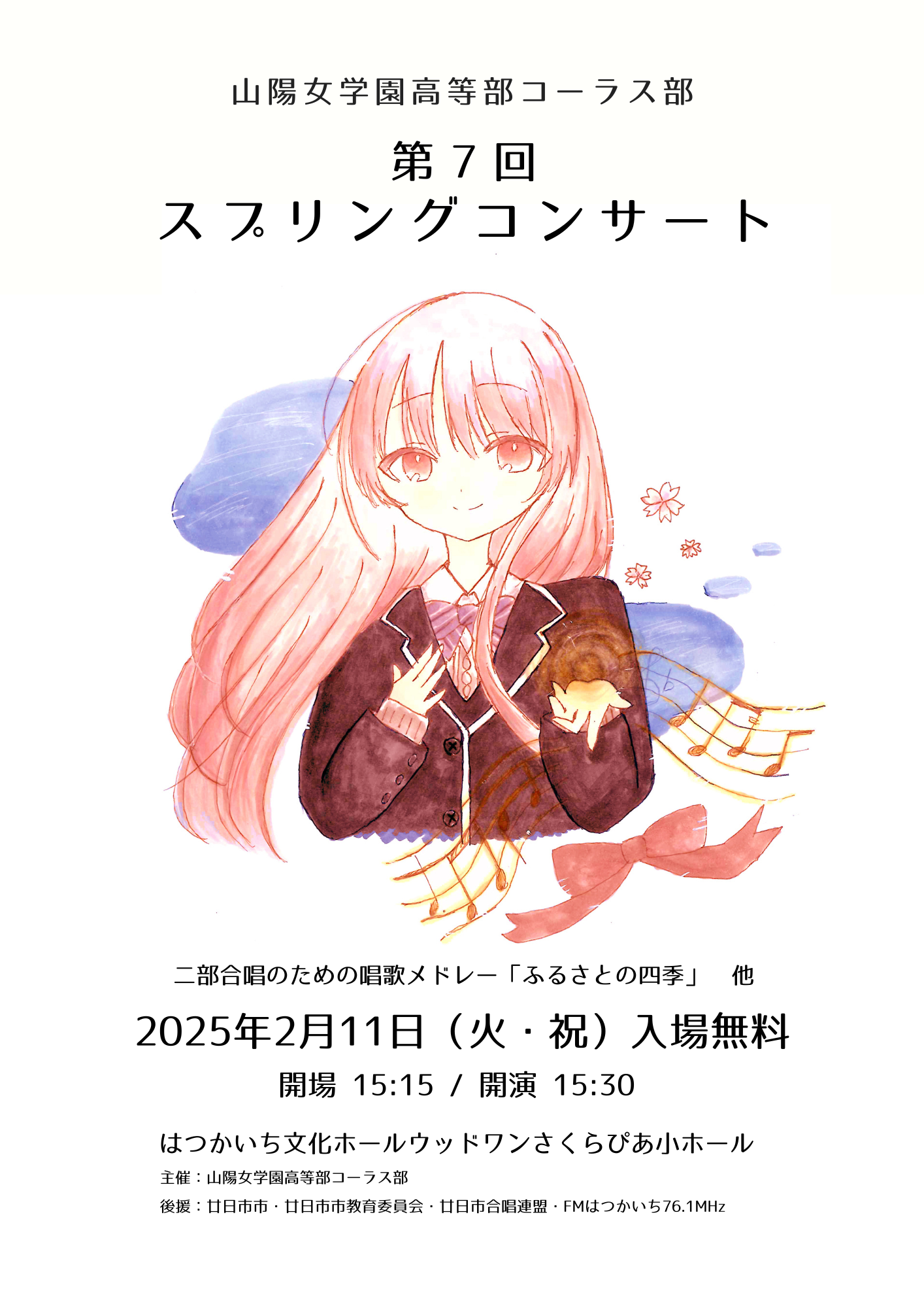 2月11日(火・祝)廿日市文化ホールウッドワンさくらぴあ小ホールにて、「第7回スプリングコンサートを開催しました。会場にお越しいただいた方からは、心が洗われた、感動で涙があふれた、ダンスが素敵だったなど沢山のメッセージをいただきました。次回の本番は、6月8日に開催される廿日市市合唱祭に出演する予定です。今後とも応援よろしくお願いします。