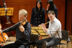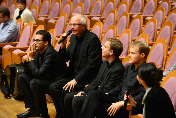 リハーサル室で行われた管クリニックでは、管楽器の神様たちが、メンバーと向かい合って着席。