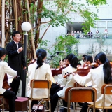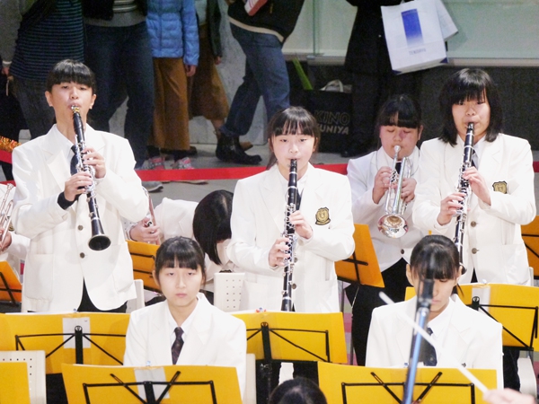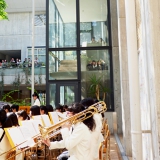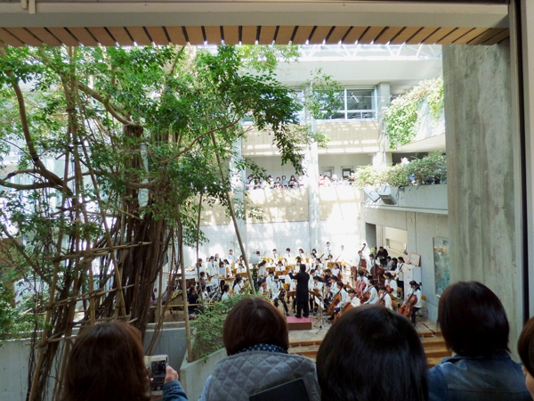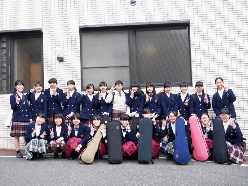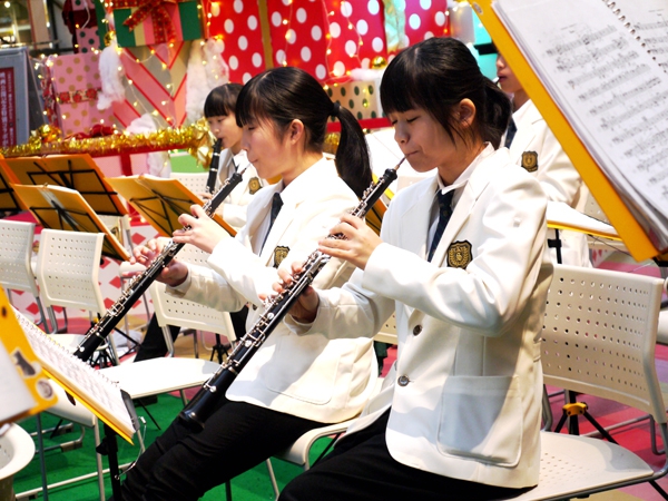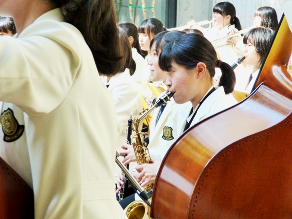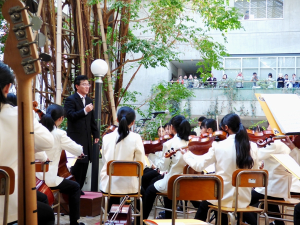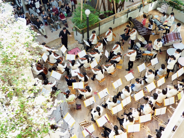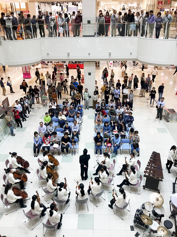 アルパーク東棟2階時計の広場にて、「がんばれ!学生応援企画 部活発表会」という催しが開催されました。参加したのは、県立廿日市高等学校、修大附属鈴峯女子高等学校、そして私たち山陽女学園中等部・高等部。山女からは6つのクラブが出演し、管弦楽部は大トリでした。台風が接近し天候がどんどん悪化していく中、多くの方々が私たちの演奏を最後まで聞いてくださいました。