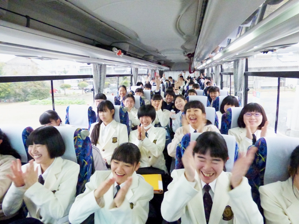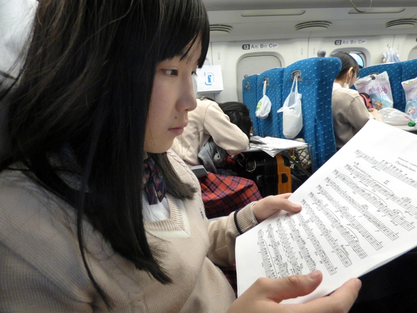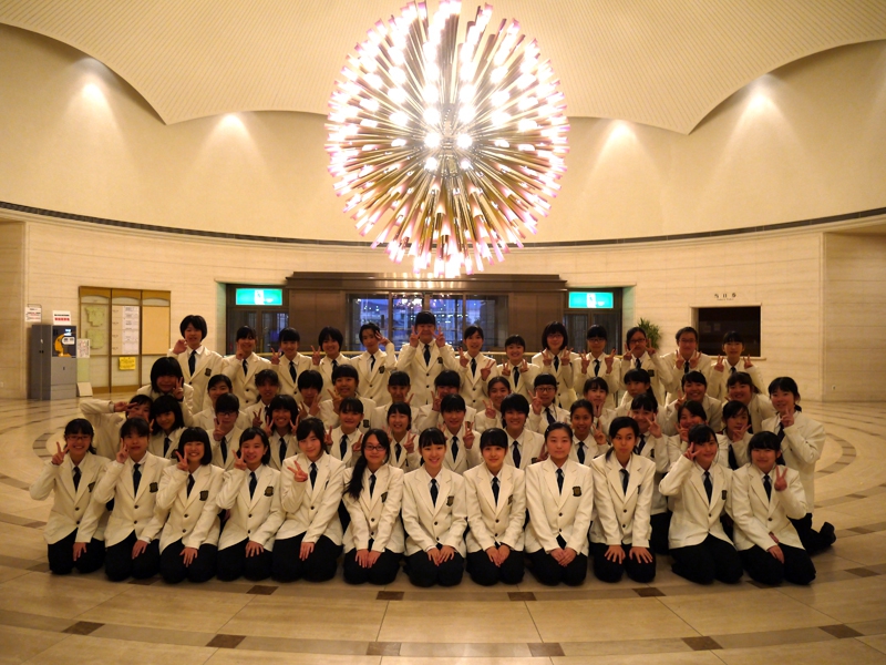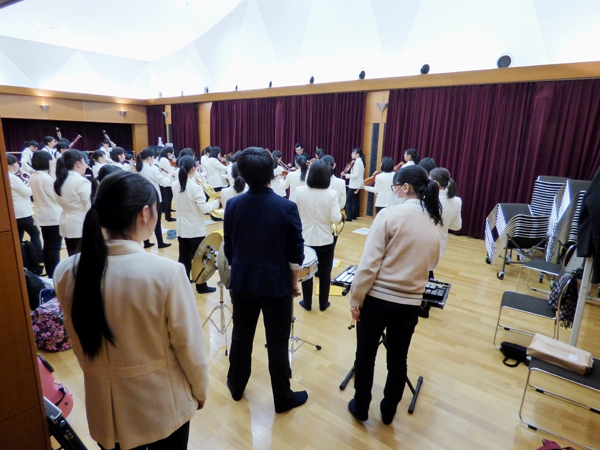 7時半に広島駅集合、その後新幹線で一路東京へ。品川駅で貸し切りバスに乗り換えて、会場となる「日本青年館ホール」へ向かいました。現地でのリハーサルはないので、他校の演奏を聴き、ホールの響きの特徴をつかみ、チューニングでイメージを共有して、本番に臨みました。