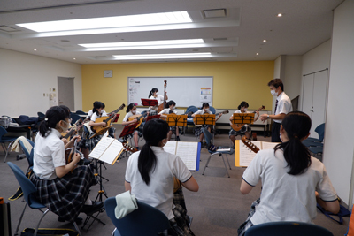 大阪府泉佐野市で行われた令和3年度全国高等学校ギター・マンドリン音楽コンクールに出場しました。高等部3年生は集大成ということもあり、特に集中して練習に取り組んでいました。 今回選曲したのは椎根真太郎作曲「マンドリンオーケストラのための合奏曲『飛躍の時へ』」です。「過去の楽しい思い出を振り返りつつ、素晴らしい未来を思い浮かべながら、さらなる飛躍を目指していこう」という思いがこもった曲です。自分たちの高校生活にも重ね合わせて、気持ちを込めて練習しました。また、テンポやリズムが場面によって異なるので、その切り替えを特に意識して演奏しました。結果は優良賞。審査員の先生方からご指摘いただいた課題を改めて確認し、部員一同、気持ちを新たにがんばります。