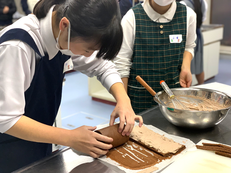 クリスマスデコレーション~チョコレート細工講座~ということで、パティシエ体験講座を開催しました。ココアを加えたスポンジ生地を2人1組で作成し、チョコレートホイップを使い、ブッシュドノエルをつくりました。