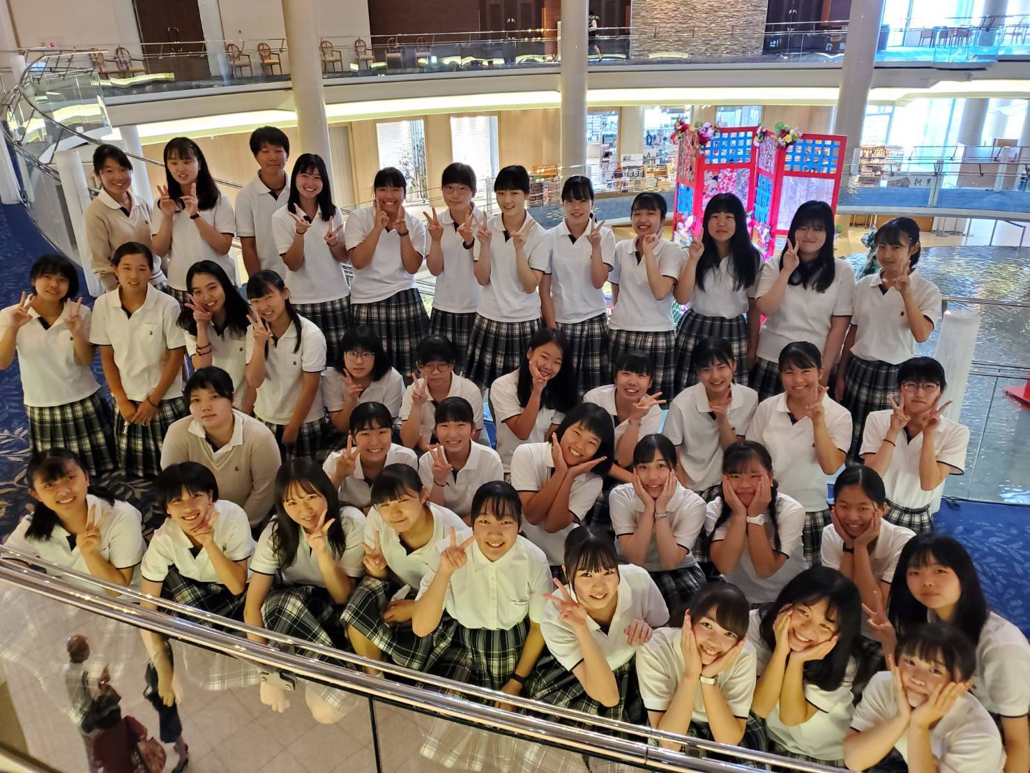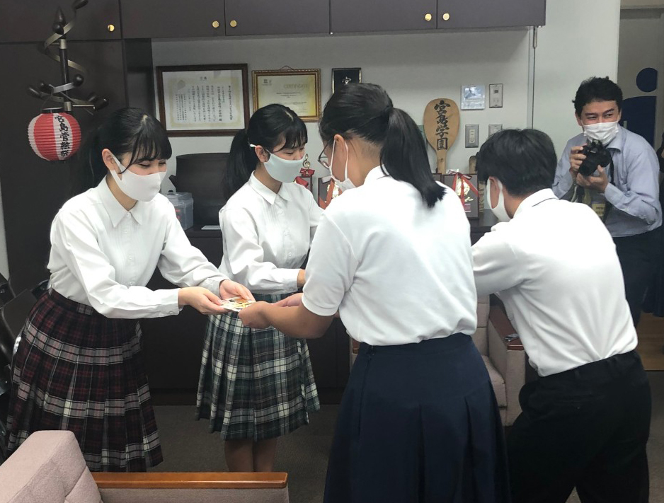2日には高等部の2人が宮島学園を訪問し、寄付金を届けた。ダンス部の3年生、田上結菜さんは「私たちの活動が(宮島を)手助けできることを、とてもうれしく思います」と話した。宮島学園の9年生(中学3年)の坂田勇太さんは、同校が参加する祭りや清掃活動を例に挙げ、「地域のために活用させて頂きます」と喜んだ。