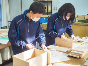 中等部2年生は木材実習を行いました。例年は、広島県木材利用センターにて、講師の先生に木材ラックの製作をご指導頂く所ですが、今年度は講師の先生を学園内にお招きして実施しました。設計図をもとに、さしがねや両刃のこぎり、やすり、げんのうなど色々な工具の使い方を学びながら製作。皆、釘を曲げずに打つことが出来ていて、素晴らしい仕上がりでした。