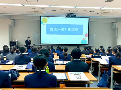 入試説明では、推薦入試のテーマ型面接のテーマを発表しました。科目別対策講座では、国語・数学・英語の入試に関するアドバイスを行いました。各科目の先生の説明を聞きながら、生徒たちはメモをたくさんとっていました。また、推薦入試対策講座では、模擬面接形式で対策を行いました。今日の入試体験会の内容が、少しでも受験対策のお役に立てれば幸いです。ご来校いただいた皆さま、ありがとうございました。