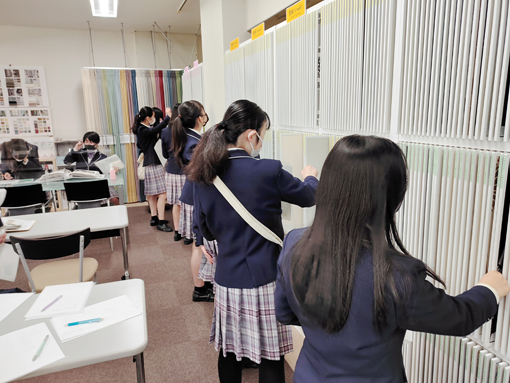 2年7組の生徒は、授業の一環で廿日市港付近にあるリリカラ株式会社広島支店へ校外研修に行きました。この研修では、実際に商材を見ることでインテリアに関する商品に興味を持つだけでなく専門的な知識を深めることができます。生徒たちは、自分らしい部屋のコーディネートのために様々な商材を選びながら、自分のイメージを形にすることができました。研修後は、いただいた商材のサンプルを用いて、それぞれが配置を考えてプレゼンボードを作成しました。