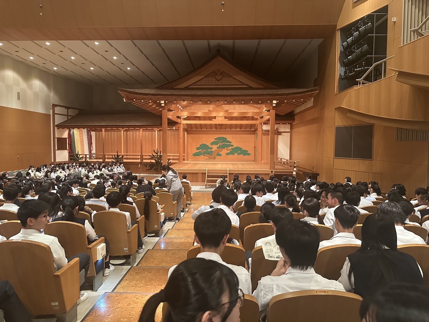 舞台の作りや能面、音楽、あらすじなどを事前学習してから広島アステールプラザ・能舞台にて鑑賞しました。当日、会場に到着すると、生徒たちは普段はなかなか見られない能舞台を興味深く眺めていました。開演してからは、演者や奏者の息づかいや迫力、情念を、間近に感じることができま