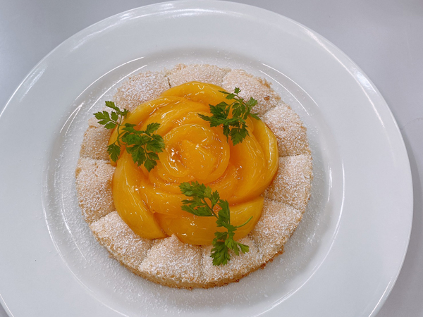 ケーキ中央に黄桃をバラのように飾り付け、ナパージュをかけ完成させました。