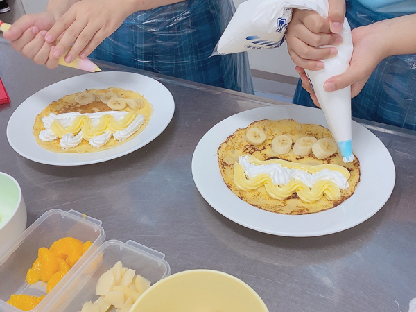 各自で好きなように盛りつけ、フルーツ盛りだくさんのクレープが完成しました。