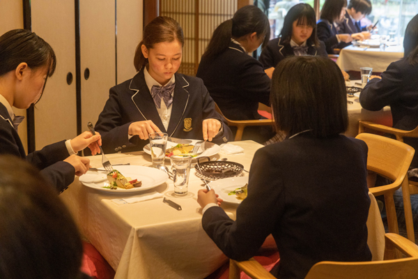 大聖院の境内では、住職の方のわかりやすい説明を聞きながら、見学することができました。さらに、テーブルマナー講習の実践では、