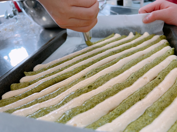 マドレーヌ作りでは生地をプレーン、ココア、抹茶の3種類から選べるようにしました。