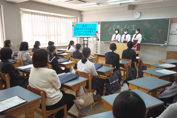 コース説明の中では、「コース在校生Q&A」ということで、中学生の頃にコースを決めたきっかけや学校生活の様子、パティシエコースの魅力を紹介しました。