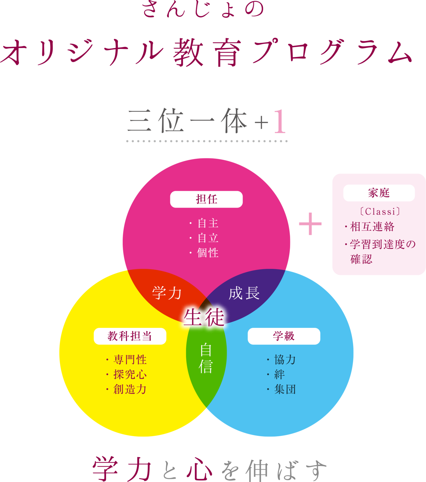 山陽女学園では、中等部1・2学年で基礎力を徹底的に身につけ、同時に学習習慣も確立していきます。この2年間の学力到達度が、大学入試の大切なカギとなると考えるからです。学力向上テスト・講習・クラブ活動などあらゆる体験をもとに可能性を伸ばしていきます。