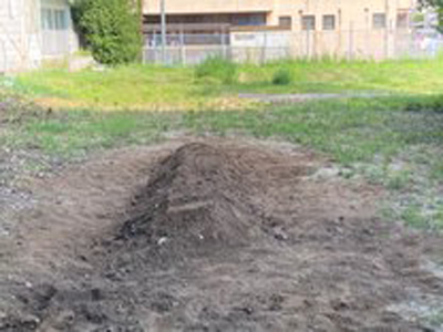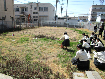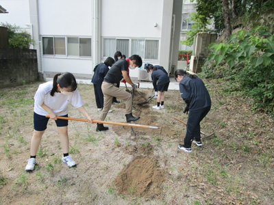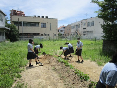 特別活動の授業でサツマイモを作ることにしました。E棟裏にある空き地の一部を畑にします。更地から耕して畝(うね)を作ることから始めました。農作業をすることが初めての生徒もいましたが、みんなで楽しく作業をすることができました。秋になって収穫したら、みんなで調理して美味しくいただく予定です。この授業を通して、みんなで協力して物事を進める力や、野菜を育てる事で、自分たちの口に入る食材についても学んで欲しいと願っています。