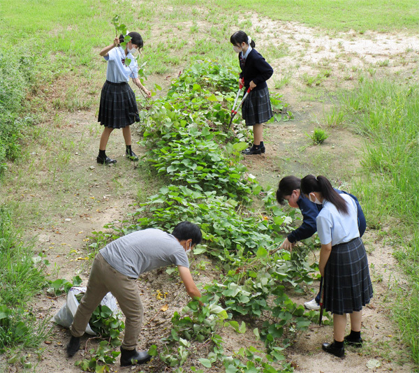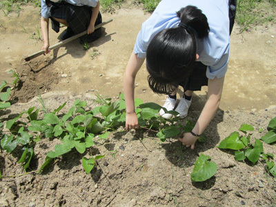 「特別活動」で、サツマイモを育て始めて2ヶ月が過ぎました。夏の間に、ずいぶん大きくなったサツマイモ。この日はみんなで「つる返し」の作業を行いました。