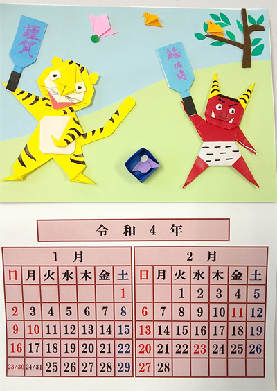 見本として、お正月バージョンのカレンダーを見せていただき、折り紙を小さく切って、カレンダーのためのパーツをたくさん作りました。細かい作業にみんな集中しています。