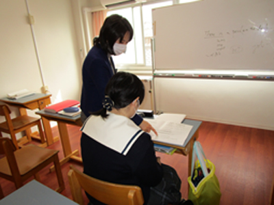 リアライズコースでは、教科や入学のタイミングにより、1人で授業を受ける事もあります。この日は、「コミュニケーション英語Ⅱ」の授業でした。教室でマンツーマン授業後、更にお昼休みの時間にも、分からないところを先生に聞いていました。これで、過去分詞がしっかり理解できたようです。