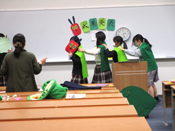 成果発表会の準備が各クラスで進められています。写真はこども教育コースの2年生です。当日は「はらぺこあおむし」の劇を行います。保育士としてこどもたちの前で演じることを想定して練習をしたり、小物を作ったりしている最中です。本番でこれまでの学習の成果をしっかり発揮できるよう、残りの練習期間も頑張ってほしいと思います。