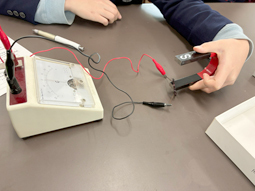 本日の中2の理科では、電磁誘導の実験を行いました。コイルに検流計をつなぎ、磁石を出し入れすると、電池を使っていないのに針が動きます。「流れた!」と、生徒たちは電流が生じたことに驚いていました。電磁誘導は、磁界が変化すると電流が生じる現象です。磁石を動かすことでコイル内の磁界が変化し、電流が流れます。止めると流れないことから、動かすことがポイントだと実感できたようです。目に見えない磁界のはたらきを確かめることができた、充実した1時間となりました。