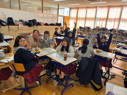 写真は中1の昼休憩の風景です。お弁当を広げてクラスの仲間と楽しい時間です。入学してもう少しで1年が経ちます。部活動も学校行事も初めてのことの連続でした。良きクラスメート、部活の仲間といろんなことに挑戦してほしいです。