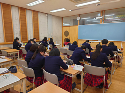 音楽室から『仰げば尊し』の歌声が響いています。中等部1年生が、高等部3年生の卒業式で披露するため、授業で練習を重ねているのです。お世話になった先輩方へ感謝を届けようと、真剣な眼差しで歌う生徒たち。その一生懸命な歌声は、きっと先輩方の心に深く届くことでしょう。当日が素晴らしい門出となるよう願っています。