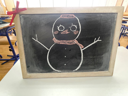 今日は、雪が降り積もり、寒い一日となりました。クラスにいくと、雪だるまの絵がかいてありました。12月の久々の大雪のときは、外で、雪合戦などして楽しみましたが、今日は、教室でおとなしく過ごしたそうです。まだまだ寒い日もありそうですが、寒さに負けず、元気いっぱい過ごしてほしいと思います。