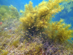 山陽女学園から南に行くこと徒歩数分、広島湾の護岸に到着します。広島湾の水中がどんな様子か、ちょっとみてみましょう。極寒のこの時期、水深10m付近ではキラキラした卵と、黄金色のアイナメのお父さんが卵を守っている様子が観察できます。そしてこの時期から春先まで、岩礁近くでは海藻が覆い繁り、魚たちが集まって元気に泳いでいます。みなさんも、寒さに負けず元気に活動しましょう!