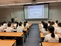 高大連携授業の一環で、日本赤十字大学広島看護大学の先生の授業を特進コース1年生と2年生は受けました。聴診器や指先ではかる酸素濃度計などを実際に使わせていただきました。看護師の仕事についてはもちろん、看護大学に行くと将来たくさんの選択肢があることなど、知らないことを学ぶことができました。既に看護師を目指している生徒はもちろんですが、そうでない生徒たちも、将来の夢に向けて考えるきっかけとなる授業でした。