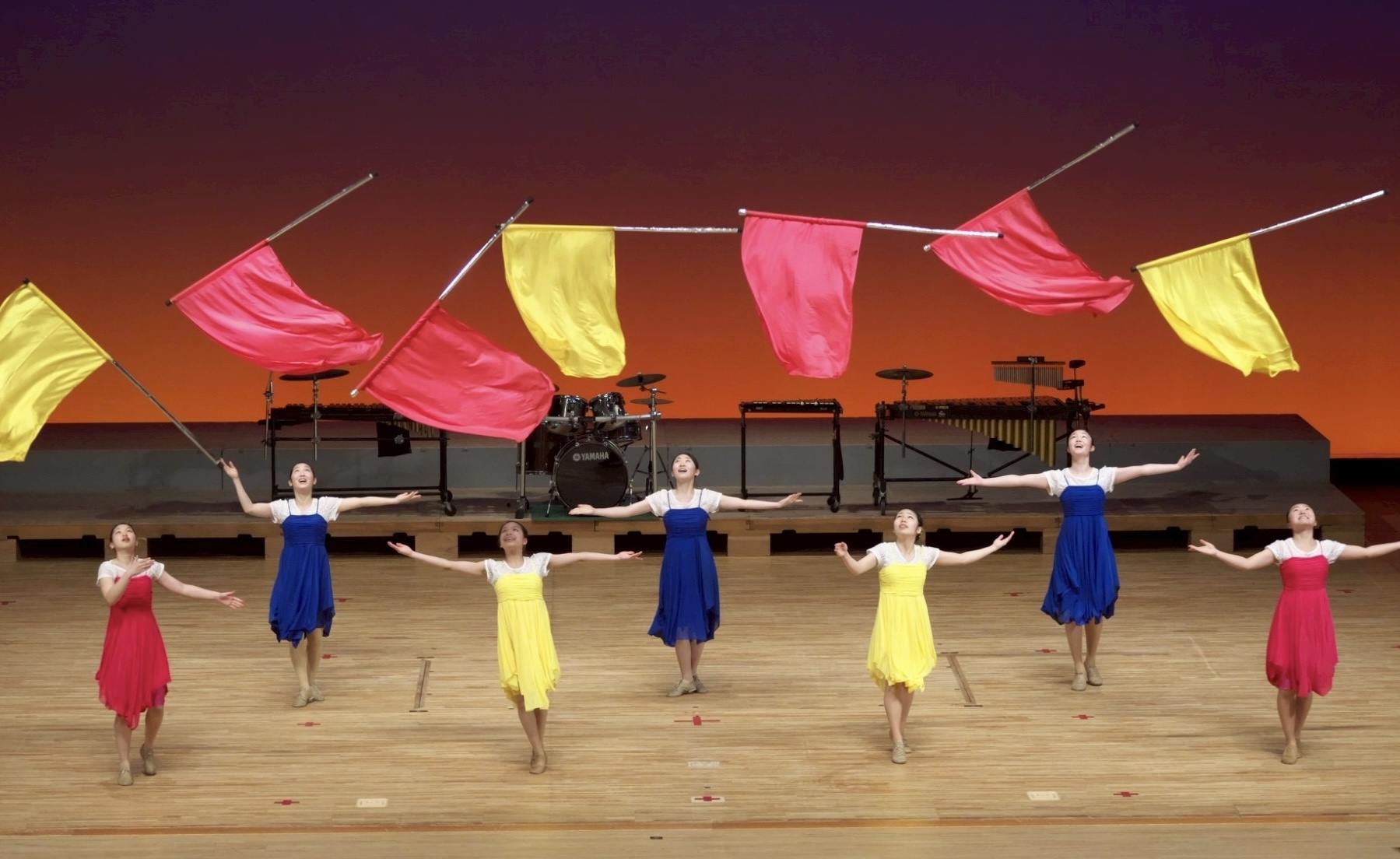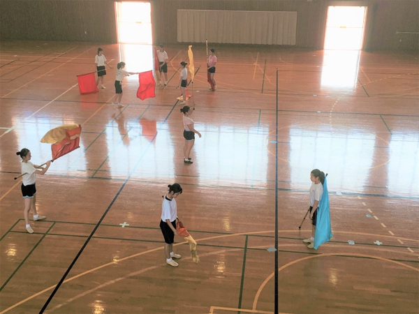 私たちカラーガード部は、「笑顔と団結、謙虚な気持ちと向上心」をモットーに、たくさんの方々を魅了できるような演技ができるよう、日々練習しています。