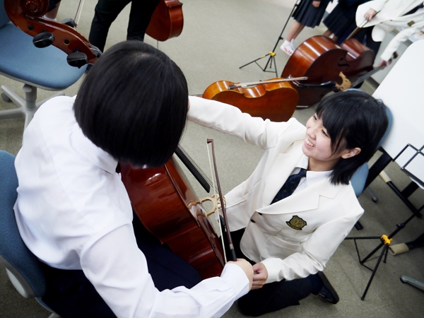 「生きる力を育む学校行事の創造と展開」~達成感、連帯感、所属感を深める体験活動~というテーマで管弦楽部の活動のようすを見学に来てくださいました。顧問から山女オケの概要や大切にしている考え方、これまで先輩から後輩へと受け継がれてきた想いをお話ししたあと、パート練習や合奏の様子を見ていただいたのち、視察にいらっしゃった先生方と部員の交流会へ。演奏や楽器のことを質問されることは多いですが、普段の活動内容や先輩後輩のつながり、どんな想いで活動しているかを聴かれることはあまりありません。部員たちは緊張しているようでしたが、自分たちなりの言葉でしっかりとお話しました。