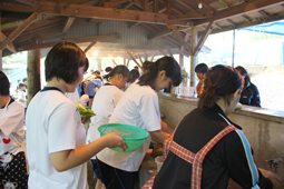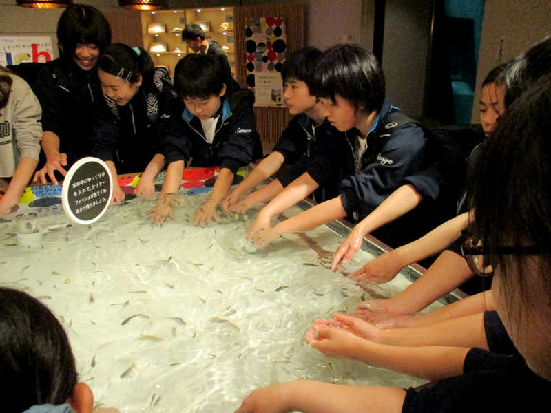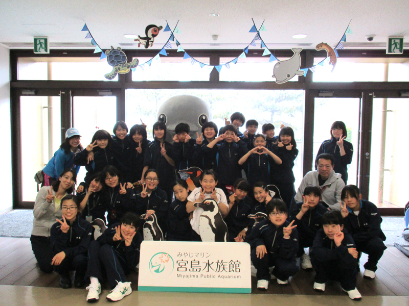 次に雨の中、互いに励まし合いながら海岸道を歩いて「みやじマリン」へ。バックヤード見学では、普段見ることのできない水族館の裏側を見ることができました。飼育員の方からスナメリの出産やアザラシのお話を聞きました。