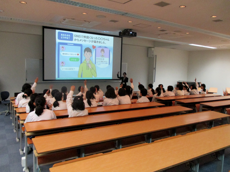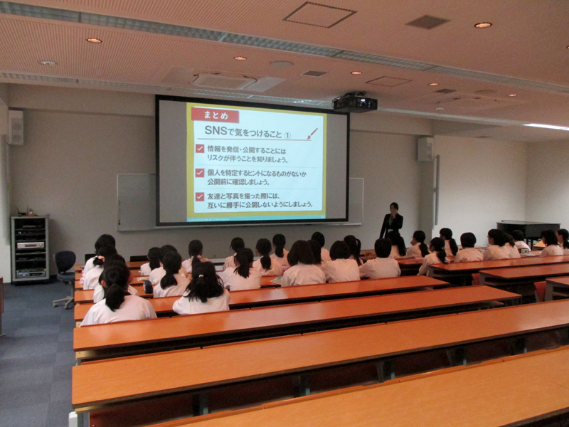 5月9日に、NTTドコモと廿日市警察署のお二人を講師に招き、中1、高1を対象にスマホ・ケータイ安全教室を行いました。携帯は身近にあるからこそ、危険性を知った上で正しく使う必要があります。困ったとき、絶対に一人で悩まず保護者や学校の先生に相談するようにと、強く話してくださいました。