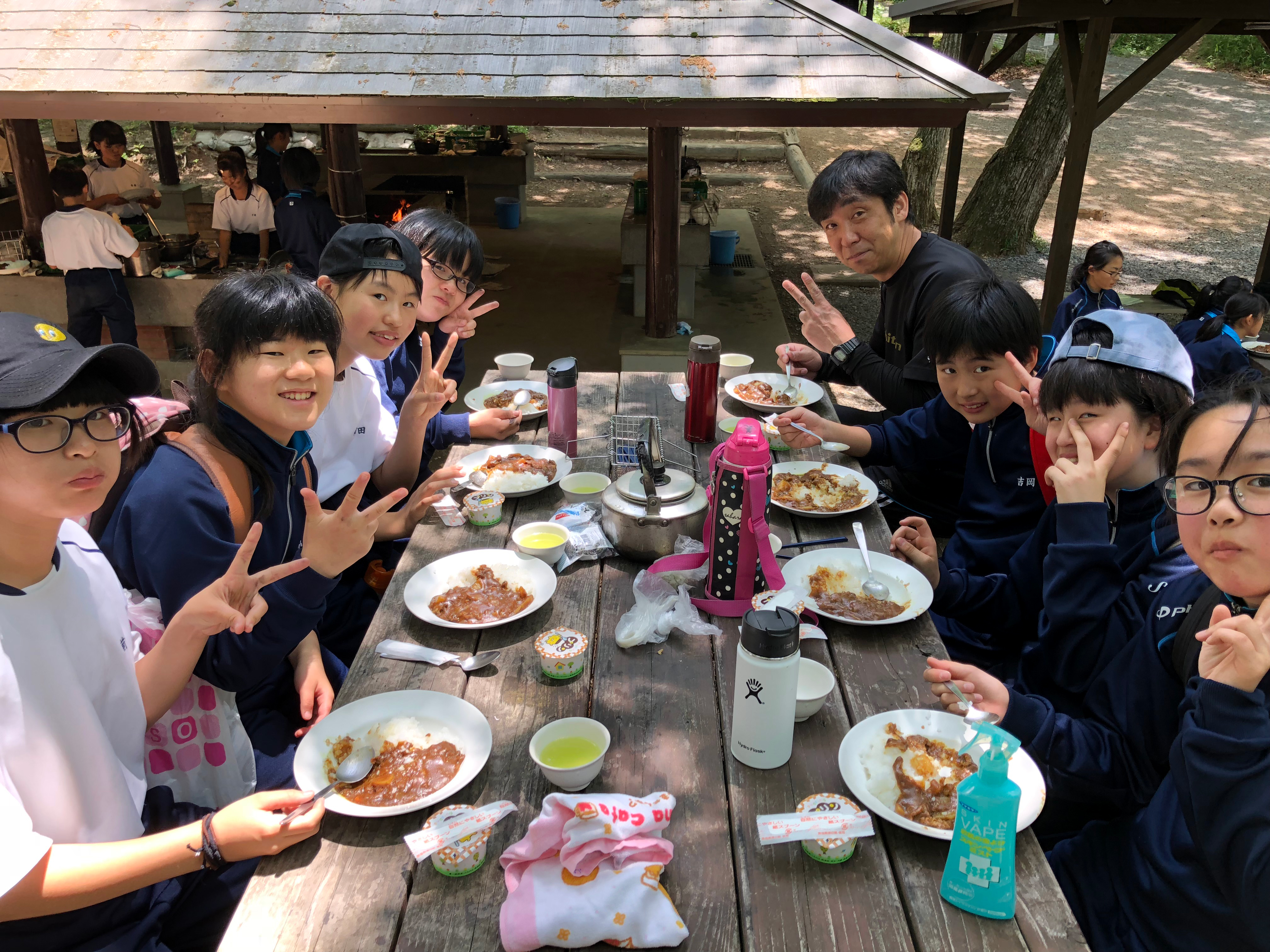 「徳地アドベンチャープログラム」で、仲間を信じ、協力しなければ達成できない活動を行いました。今回、2グループに分けて活動しました。最初はぎこちなかったグループも時間が経つにつれて、自然と声掛けができるようになりました。うまくいったときは、互いに喜び合い、達成感を味わい、絆を深めることができました。「野外炊飯」では、薪割り、火おこし、野菜を切るなどすべて自分たちで行い、各班で協力しておいしいカレーを作りました。