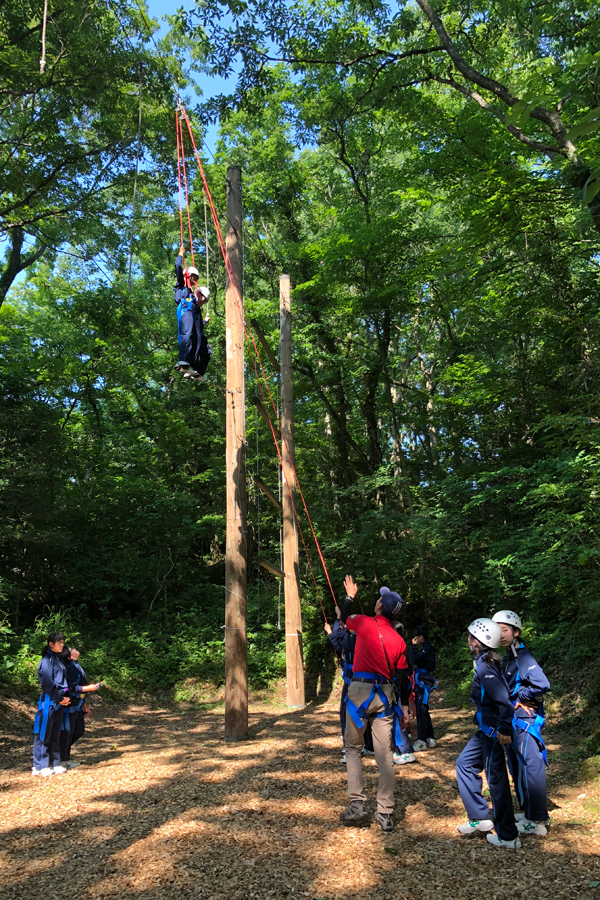 大きな丸太の上にクラス全員が乗り、乗ったまま移動して誕生日順になるという課題がありました。出された課題に対し、どう取り組むか・・・試行錯誤は続きます。声をかけあい、成功したときの表情はとても晴れやかでした。