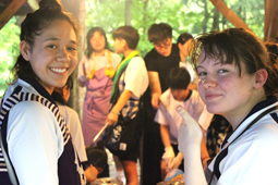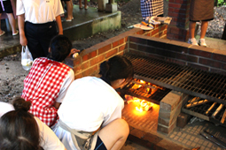 あいにくの雨だったので、出発時間を調整するために、まずは体育館でドッヂボールをしてウォーミングアップ!到着後はバーベキューの準備をしました。食べたい食材をバリエーション豊富にとりそろえ大雨に負けることなく満喫していました。