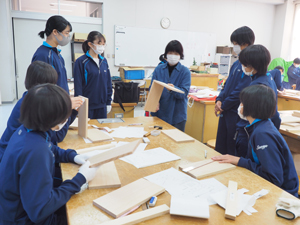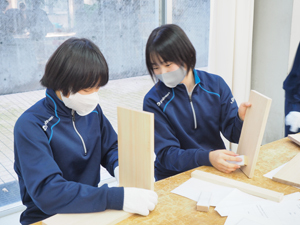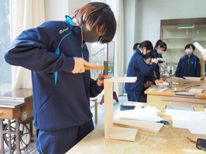 中等部2年生は木材実習を行いました。例年は、広島県木材利用センターにて、講師の先生に木材ラックの製作をご指導頂く所ですが、今年度は講師の先生を学園内にお招きして実施しました。設計図をもとに、さしがねや両刃のこぎり、やすり、げんのうなど色々な工具の使い方を学びながら製作。皆、釘を曲げずに打つことが出来ていて、素晴らしい仕上がりでした。