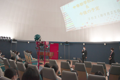 「第2回中等部オープンスクール」を開催しました。今回も新型コロナウイルス対策のため、3密をさけての開催となりました。授業体験・クラブ体験のほか、今回児童対象の説明会を「プラネタリウム」で行いました。プラネタリウムで非日常の空間を体験し、児童の皆さんが楽しんでいる様子を見て、とてもうれしく思いました。ご来校くださいましてありがとうございました。次回の入試説明会、10月16日(土)も皆様のご来校をお待ちしております。