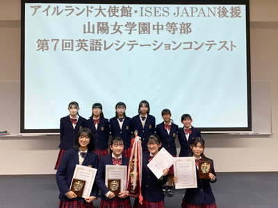 11月20日(土)に「アイルランド大使館・ISES JAPAN後援 中等部英語レシテーション(暗唱)・コンテスト」を開催しました。1年生がアイルランド発祥とされる「ジャック・オ・ランタン」の歌、2年生が「アイルランドの国花、シャムロックについて」の説明文、そして3年生が「ジャック・オ・ランタン」の物語をそれぞれ暗唱しました。会場では各学年の予選を勝ち抜いた10名が、練習の成果を披露しました。また今年度から、発表者は発表後に1分間の英語スピーチにも挑戦しました。英語のスピーチを覚えて発表するというのは大変難しく、一人一人の緊張感が伝わってきました。全員の発表が終わり審査発表を待っている時は晴れ晴れと充実した表情でいっぱいでした。そして正確さも表現力もそなえた2年生山本瑛菜(やまもとあきな)さんがグランプリを受賞しました。おめでとうございます。今後のさらなる成長に期待しています。