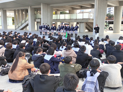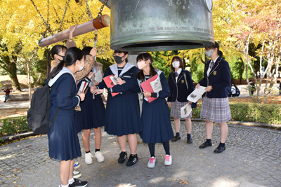 未来探求コース2年7組の希望者が、広島市平和記念公園にてガイドのボランティアに参加しました。この日は、修学旅行で訪れていた大阪府泉佐野市日根野中学校3年生の生徒151名に平和公園内にある慰霊碑などの説明を行いました。生徒は1年間の授業を通じて、平和学習だけではなく実際に相手に伝えるための方法も学んできました。最初はお互いに緊張していたようですが、徐々に打ち解けていき、平和の大切さについて中学生の心を動かせるような丁寧な説明をする姿を見ることができました。