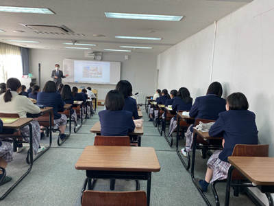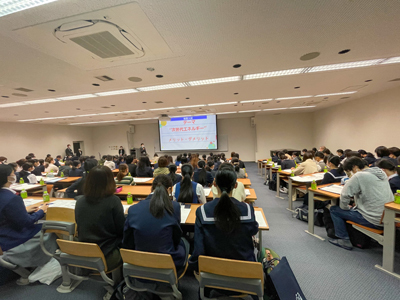 11月5日(土)に、広島国際大学の方にご来校いただき、医療に関わる仕事にはどんなものがあるのかや、病院で働いたり患者さんと接する仕事以外に医療の知識を活かした仕事(周辺産業)があることも知ることができました。