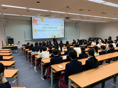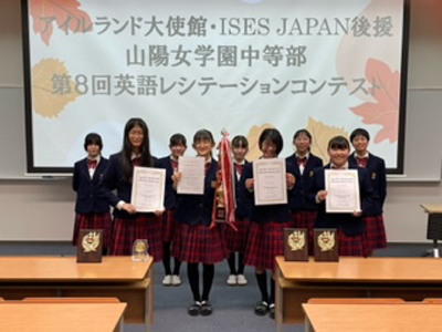 11月19日(土)に「アイルランド大使館・ISESジャパン後援 第7回中等部英語レシテーション・コンテスト」を開催しました。当日は各学年の予選を勝ち抜いた9名が練習の成果を発揮してくれました。1年生はアイルランド発祥とされる「ジャック・オ・ランタン」の歌、2年生は「アイルランドの国花、シャムロックについて」の説明文、そして3年生が「ジャック・オ・ランタン」の物語をそれぞれ暗唱しました。また、暗唱の後で昨年度同様に1分間の英語自由スピーチにも挑戦しました。身振り手振りを加えて発表する生徒や、緊張しているとは思えないほど堂々と発表している生徒もいました。そして3年生の山本瑛菜(やまもとあきな)さんが昨年度に引き続き最優秀賞に輝きました。おめでとうございます。今後のさらなる成長に期待しています。